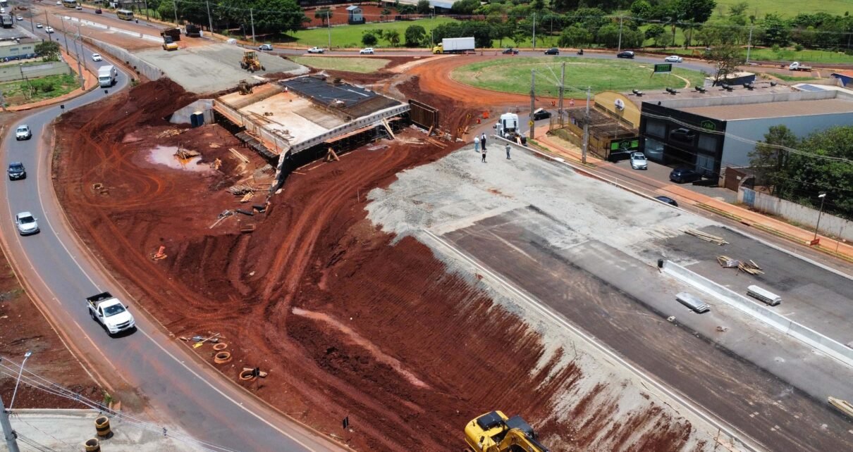 Os serviços de pavimentação estão em andamento nos acessos à pista superior do viaduto, com terraplenagem quase terminada e dispositivos de contenção já concluídos. A pavimentação também está em andamento na rotatória norte, cuja execução foi adiada para compatibilização com o sistema de abastecimento de água da Sanepar. A implantação do sistema de drenagem da interseção também está na reta final.